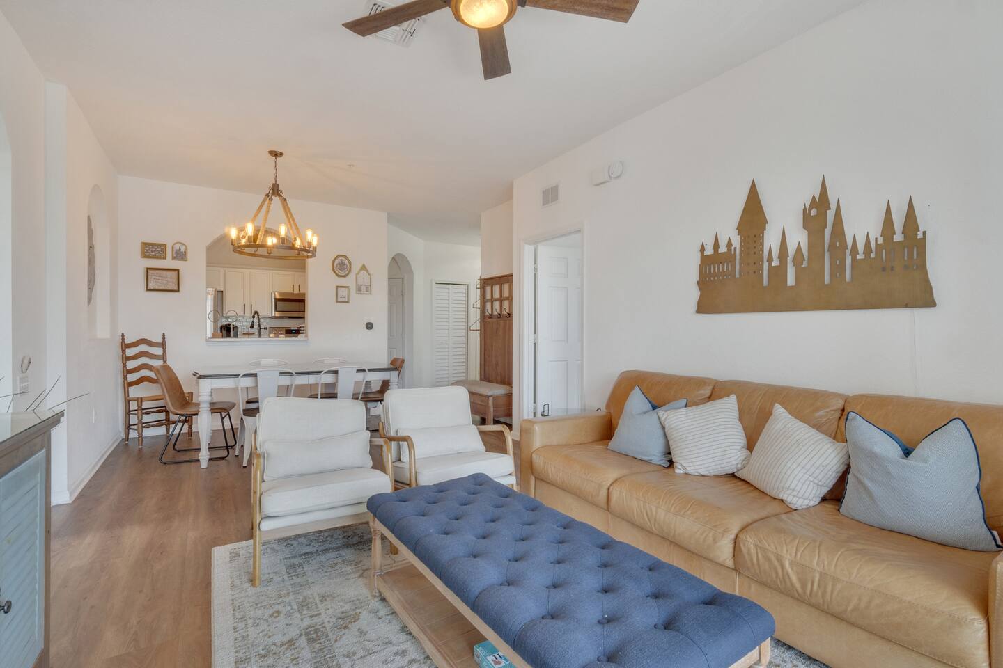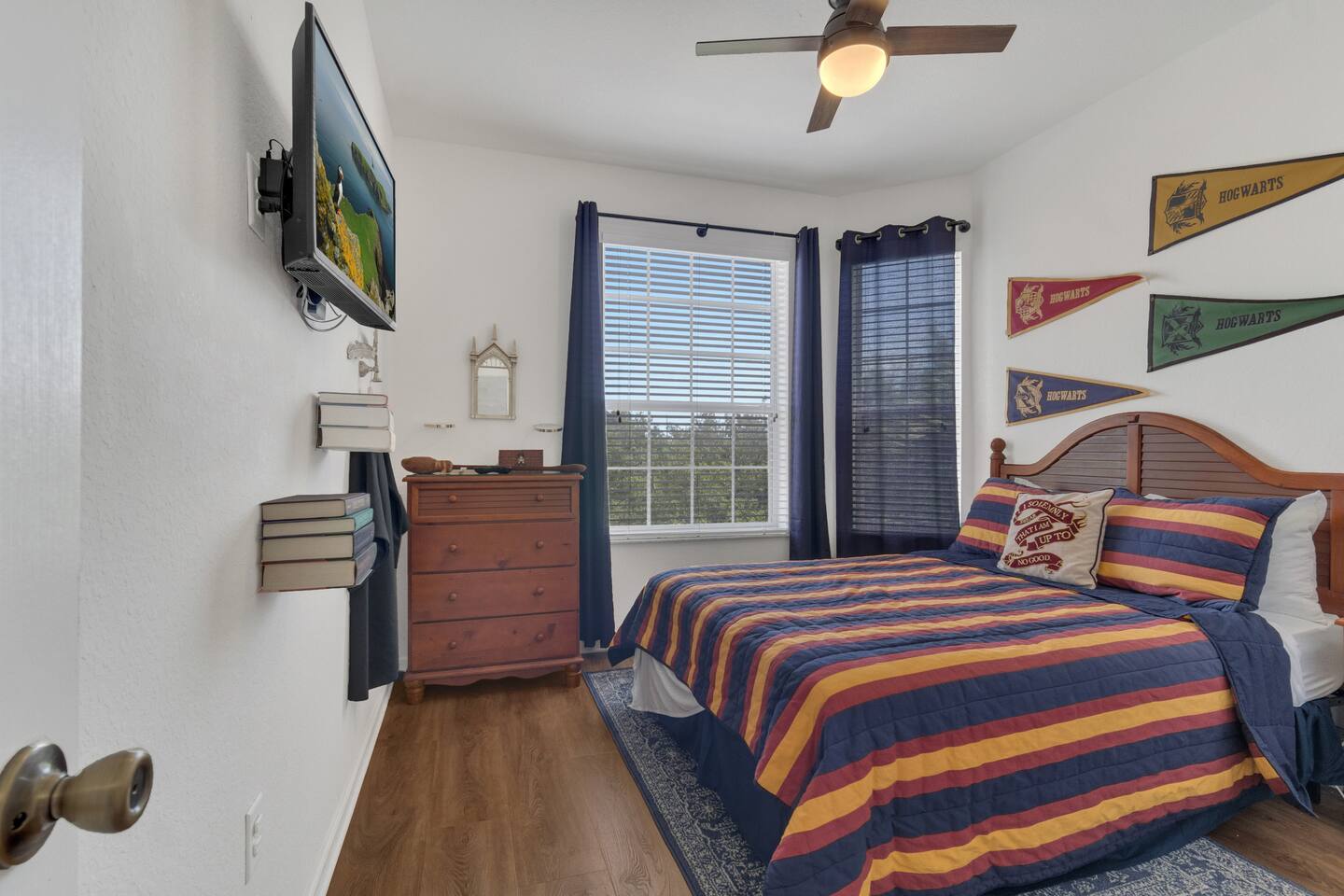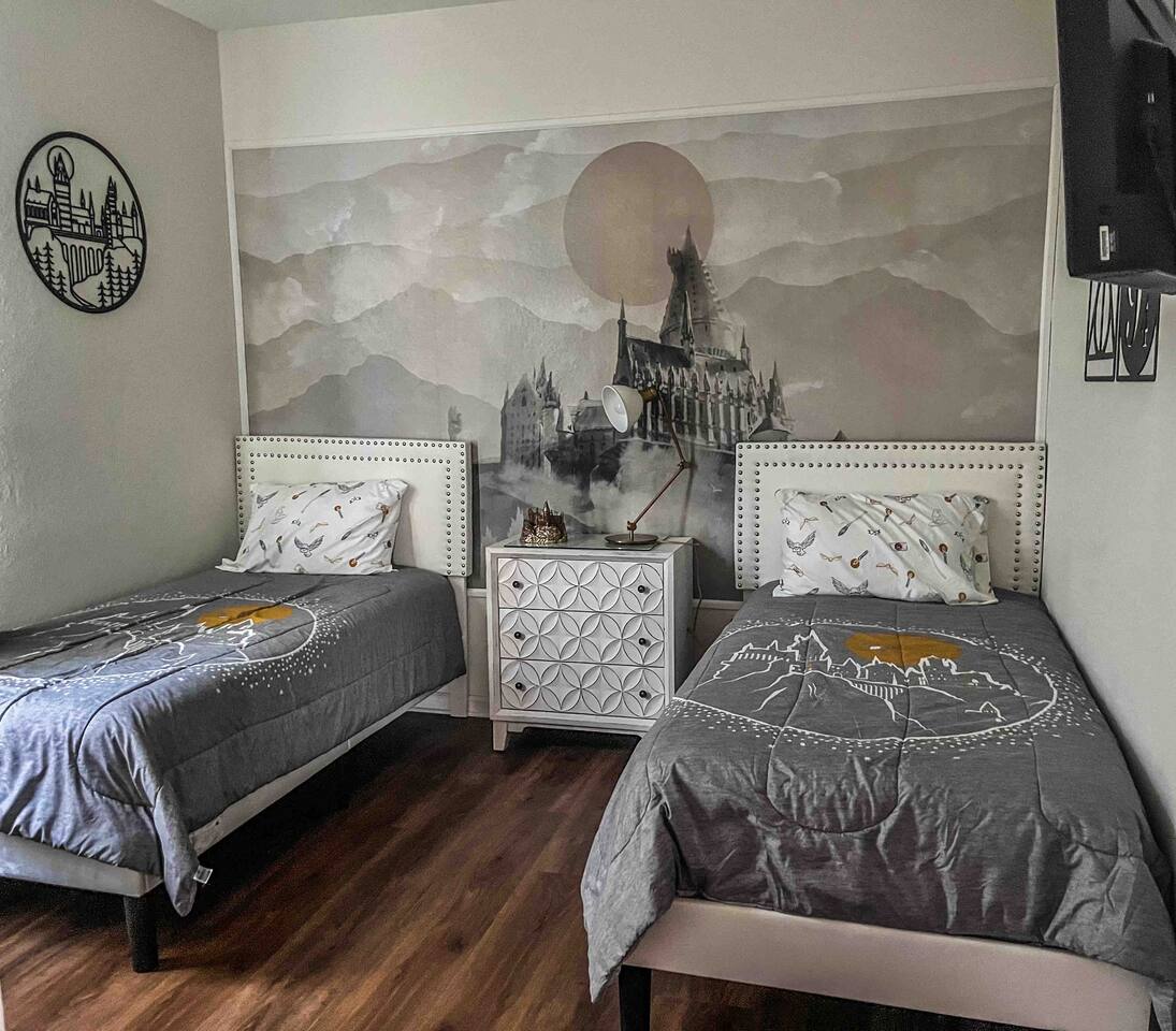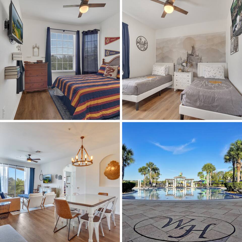Welcome to a magical stay designed for families, fans, and anyone who wants their vacation to feel unforgettable. This immersive Harry Potter condo blends wizarding décor with modern comfort, creating a space that delights kids while still feeling relaxing for adults. The open living area features comfortable seating, a smart TV, and fast Wi-Fi — perfect for relaxing after a full day at the parks. The fully equipped kitchen includes stainless-steel appliances, cookware, and everything needed for family meals. 🧙 Sleeping Arrangements 3 themed bedrooms inspired by the wizarding world 2 full bathrooms with hotel-style cleanliness Sleeps families and groups comfortably Why Guests Love This Condo ✨ Closest building to Windsor Hills pool & clubhouse (gym, movie theater and arcade at the clubhouse) ✨ Themed décor that kids go crazy for ✨ Gated resort with 24/7 security ✨ Quick, easy drive to Disney parks (about 5 minutes) ✨ Washer & dryer in unit ✨ Free parking + keyless self check-in