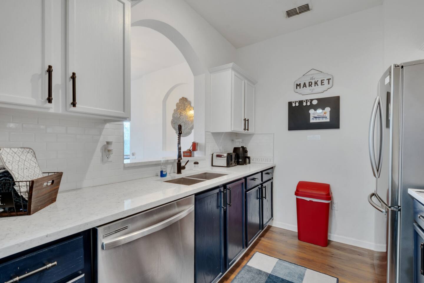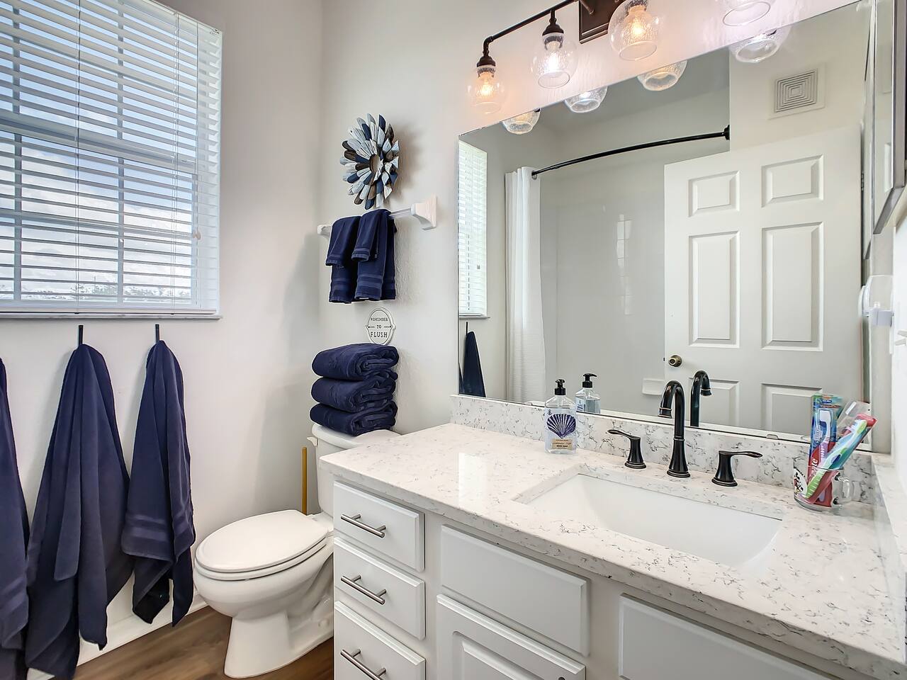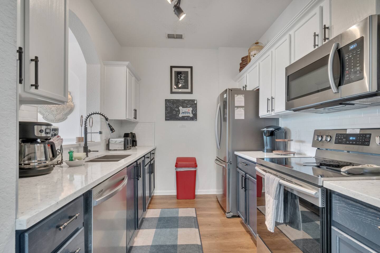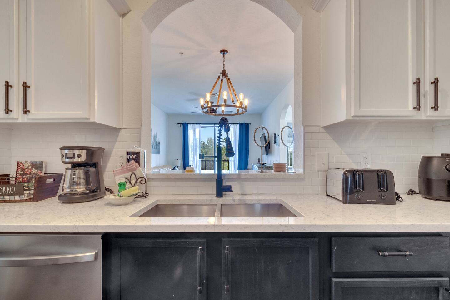 We provide a starter pack of essentials (toilet paper, paper towels, trash bags, dishwasher pods, hand soap) plus linens, bathroom & pool towels, air fryer and full kitchen setup.