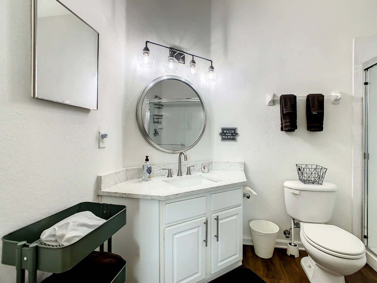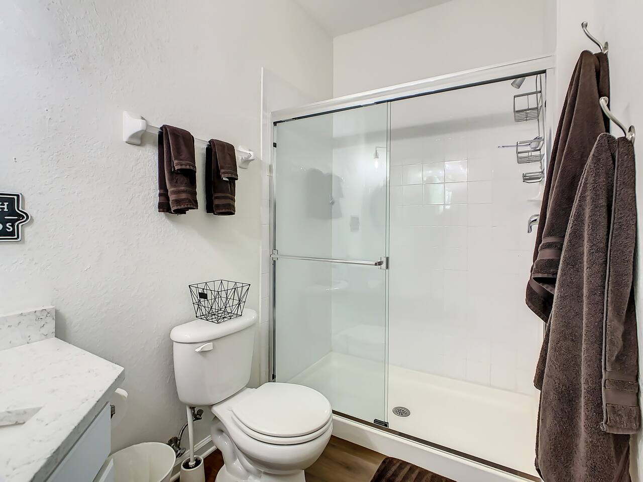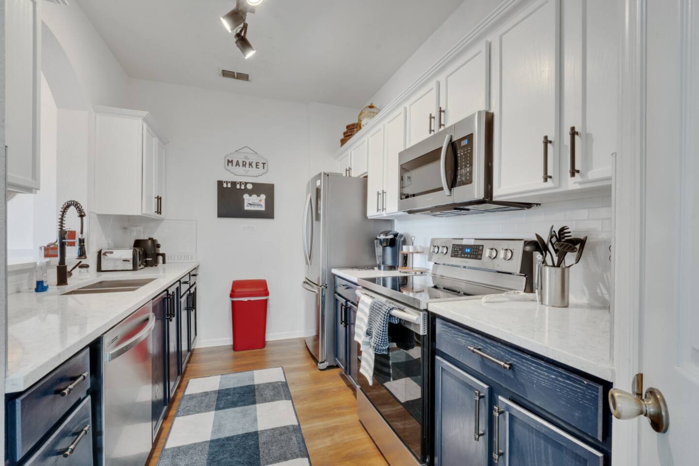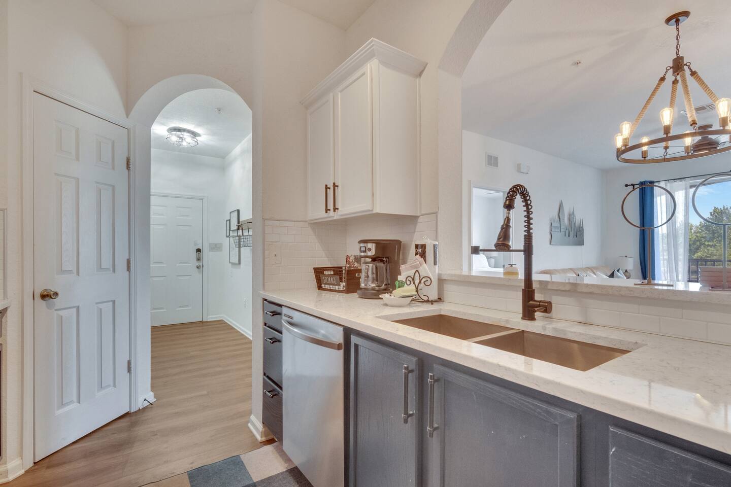 We provide a starter pack of essentials (toilet paper, paper towels, trash bags, dishwasher pods, hand soap) plus linens, bathroom & pool towels, air fryer and full kitchen setup.